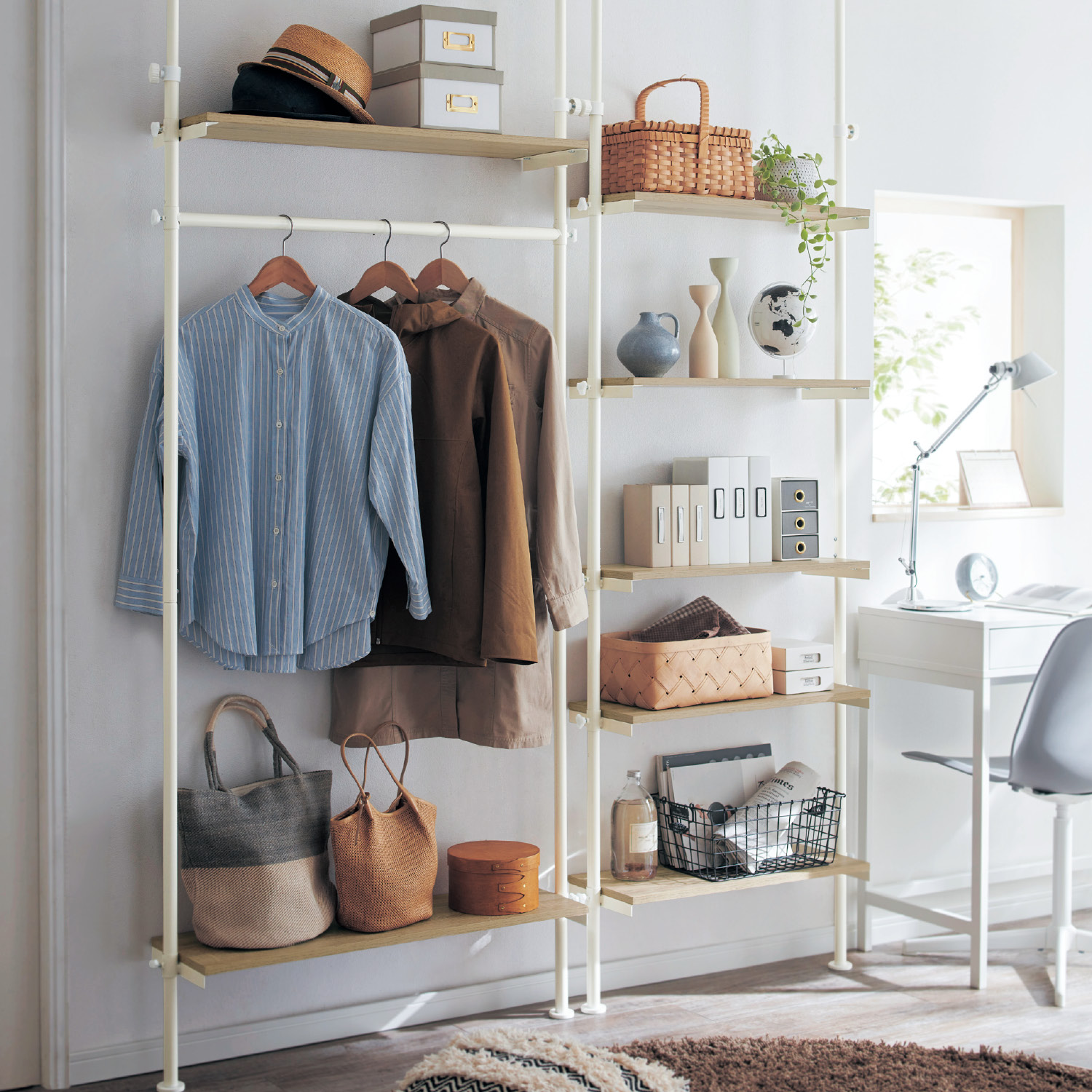 ニトリの棚付きハンガーラック「ポッパー」は洋服を掛けすぎてもガシャンと落ちない構造になっているのが素敵です。また、棚板の上にカバンなどを乗せることができるのでスペースの有効活用にも役立ちます。